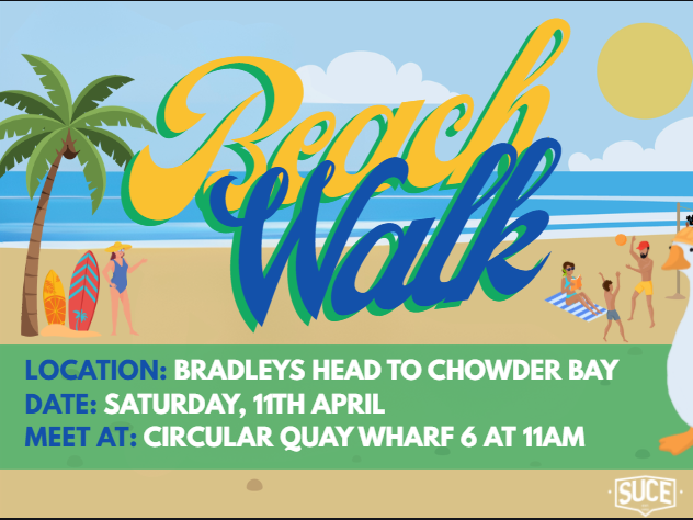 Come along for a scenic coastal walk, good chats, and a fun day out in the sun! ππΆββοΈπΆββοΈ Weβll be walking from Bradleys Head to Chowder Bay, so bring your friends, wear something comfy, and get ready for a relaxing day with SUCE πππ Itβs the perfect chance to meet new people, enjoy the views, and take a break from uni life together πΏ